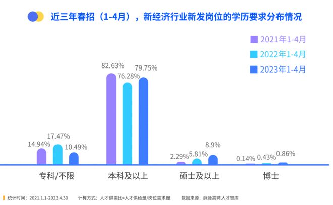 《报告》显示,2023年春招,要求本科及以上学历的岗位占比为9.75%,增幅3.47%;要求硕士及以上学历的岗位占比为8.9%,增幅3.09%;要求博士及以上学历的岗位占比为0.86%,增幅0.43%。专科人才的竞争最为激烈,其供需比为3.53。本科人才的供需比为2.34,硕士人才的供需比为1.32,博士及以上人才的供需比为1.23。本科人才面临的不只庞大的本科求职群体,更面临硕士、博士等群体降级就业的挤压。这导致本科人才的学历通胀情况更为严重。