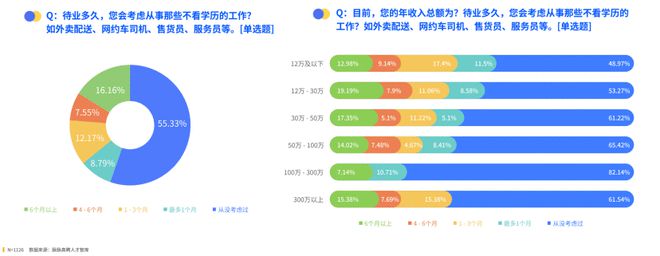 《报告》显示2023春招期间,没有工作变动的职场人占比为44.4%,而2022年2月底的调研显示这一数字为23.77%。2023年春招,计划跳槽的职场人占比20.69%,去年2月这一数字为49.71%。今年春招只有14.74%的职场人主动跳槽。约45%的求职者考虑过从事不看学历的工作,如外卖配送、网约车司机、售货员、服务员等。20%的求职者最多待业3个月就会选择的“降级就业”。