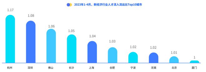 《报告》显示,2023年第一季度,杭州人才供给量同比增长近20%。2023年春招期间,杭州超过北上广深成为人才吸引力最强的城市,人才流入流出比最高达到1.17。