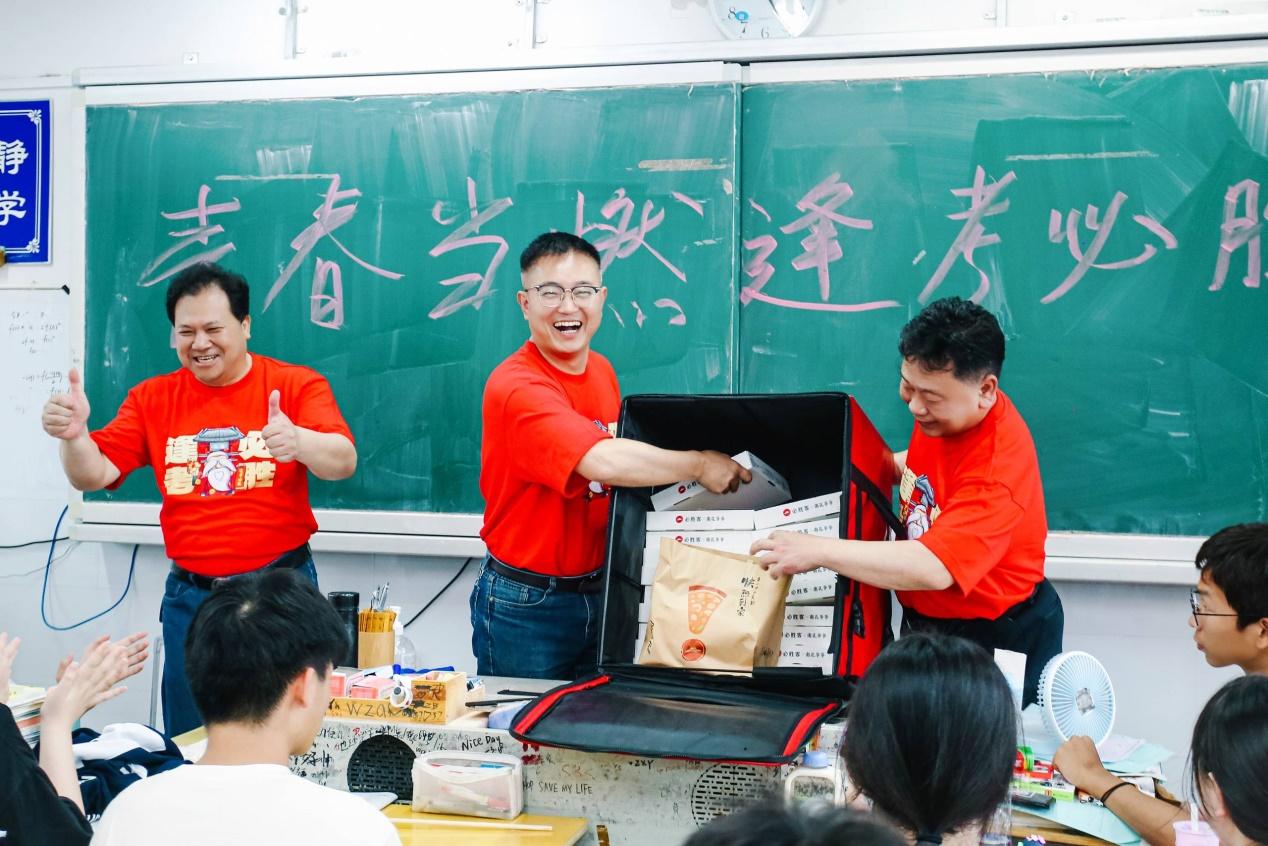 回到教室,同学们收到了更大的惊喜。校领导们已提前在教室门口守候,他们将为高三全体学生送去特别的祝福——来自湖南必胜客为高三学子们准备的寓意美好的“必胜”大餐。