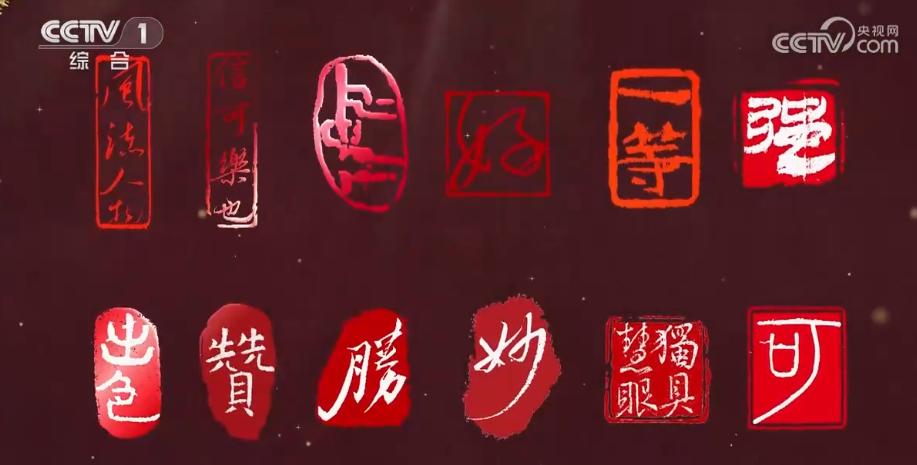 由30位书友作品(局部)集合组成的《中国书法大会》版《兰亭集序》节目组从书法作品的落款钤印中汲取灵感,从古代著名碑帖中集字制作成“名家点赞章”,李斯的“可”、王羲之的“独具慧眼”、毛泽东的“胜”,嵌入当下生活中的情绪表达,作为选手答题正确的奖励。
