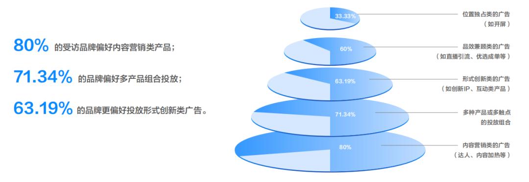 调研显示,内容营销依然是品牌主最青睐的品牌投放方式,有80%的受访品牌偏好内容营销类产品;而组合式投放和创新类广告也正在迅速成为品牌主的“新宠”。