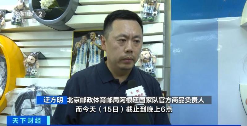 北京邮政体育邮局阿根廷国家队官方商品负责人 迂方明:6月14日,我们的销售额大概是15万元到16万元。6月15日截止到18点,销售额已经破了100万元。店里一共有56个品种,现在20多个品种卖完了,卖得最快的是阿根廷国家队大巴车。