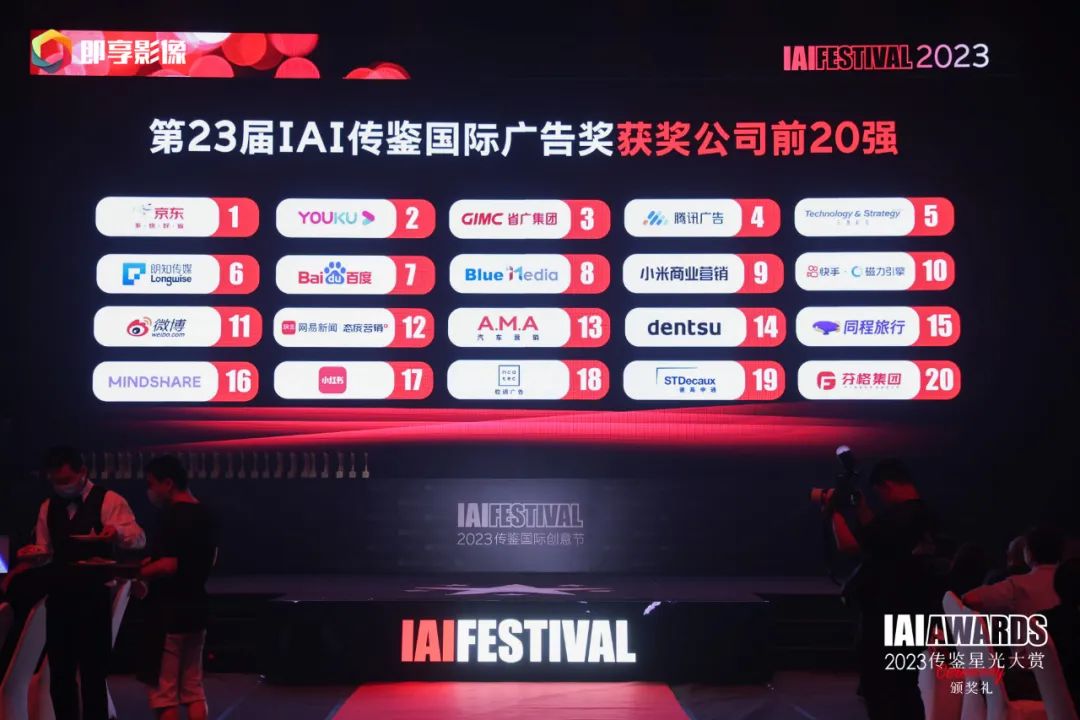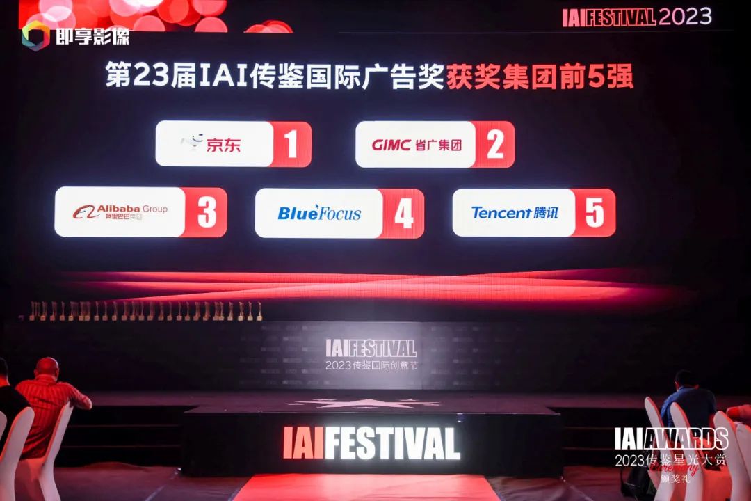 2023传鉴星光大赏公布了第23届IAI传鉴国际广告奖获奖集团排名前5强,分别是京东集团、省广集团、阿里巴巴、蓝色光标集团和腾讯,以及获奖公司前20强榜单。第23届IAI传鉴公司与人物类颁奖礼,表彰在各个领域、各个维度内的优秀公司、社会机构和杰出人物。