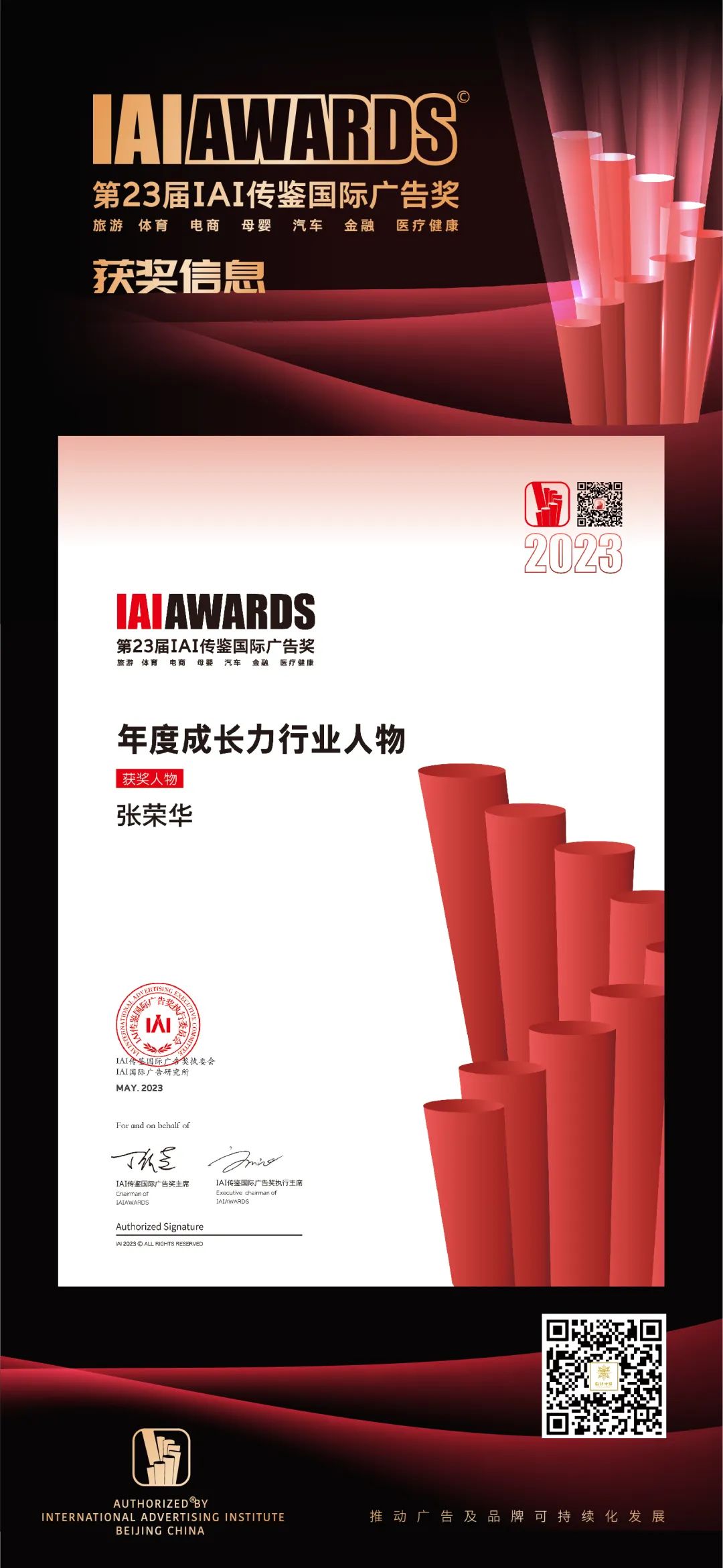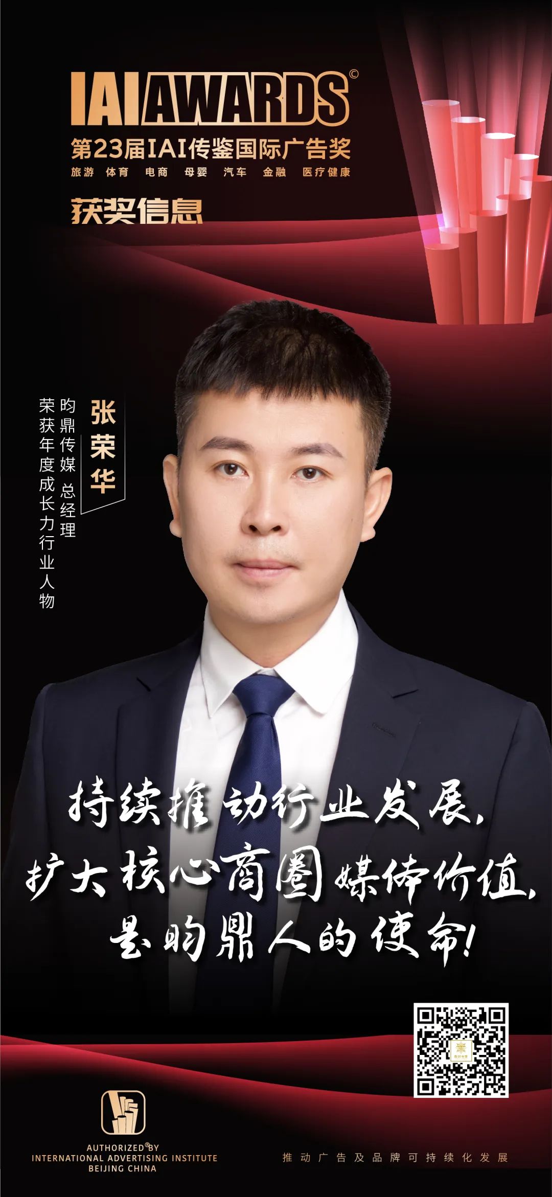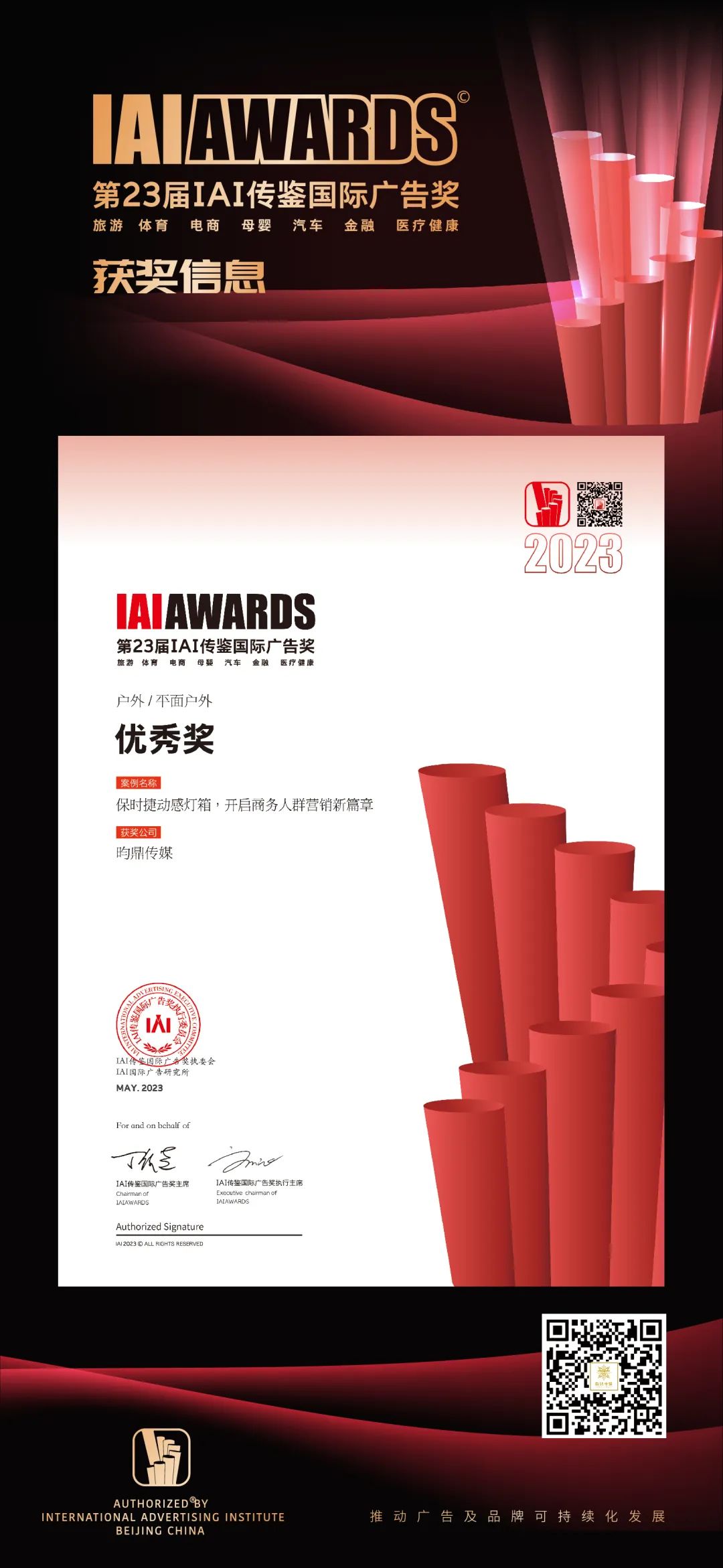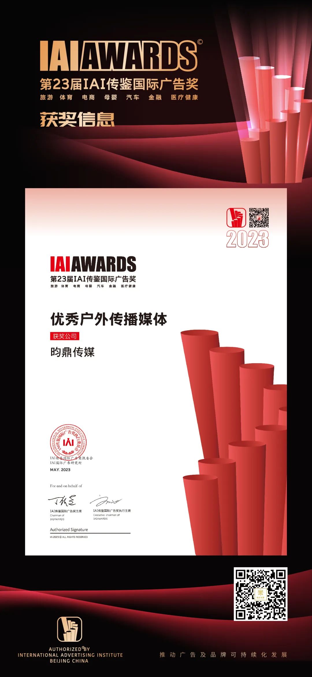 6月15-16日,第23届IAI传鉴国际创意节暨 IAI传鉴颁奖礼在北京东亿天弘演播大厅隆重举行。本届赛事共收到来自各行业领域的作品案例3755件,最终有1043件作品进入终审。经过激烈角逐,昀鼎传媒荣获年度成长力行业人物、优秀户外传播媒体及户外广告优秀奖三项大奖!
