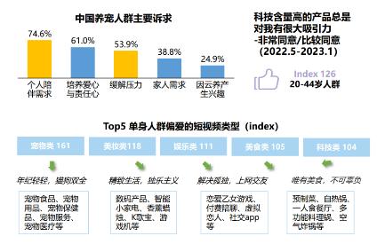 单身人群数量呈现出逐年增长的趋势,一人户家庭超过1.25亿户,单身经济对赛道发展正起到越来越重要的作用。另外,因疫情产生的巨大的不确定性促使消费者更加关心自身的心理健康,养宠成为了治愈自己、舒缓身心的选择;家居生活品质也是消费者关注的重点,高科技产品对年轻人群有很大的吸引力。基于单身人群偏爱的短视频类型来看,宠物类、数码类、预制菜等多个新锐赛道获得了快速发展的机会。