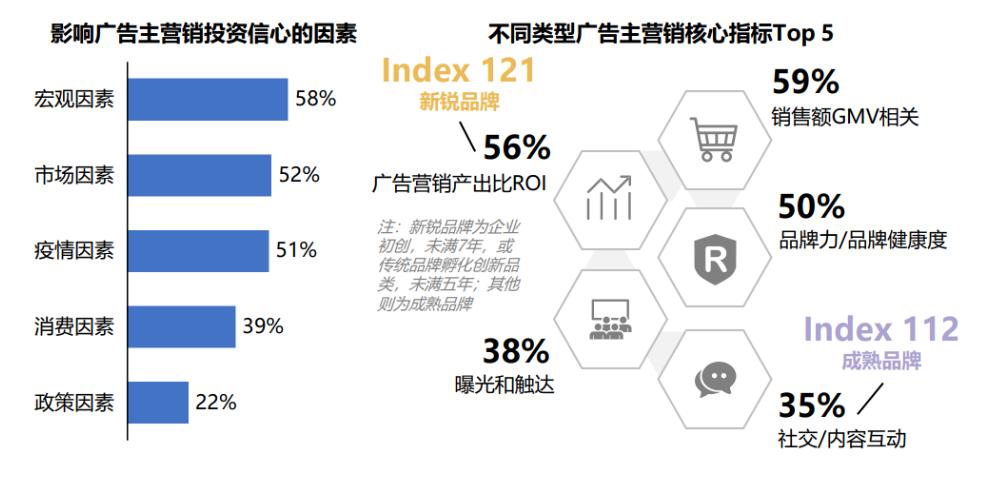 近6成的品牌主认为宏观因素对营销投资信心的影响最大,基于目前的大环境,销量成为了品牌营销最为优先考虑的指标。进一步看,新锐品牌主更加倾向于营销产出比,成熟品牌除销量外还注重品牌内核与影响力的传达。
