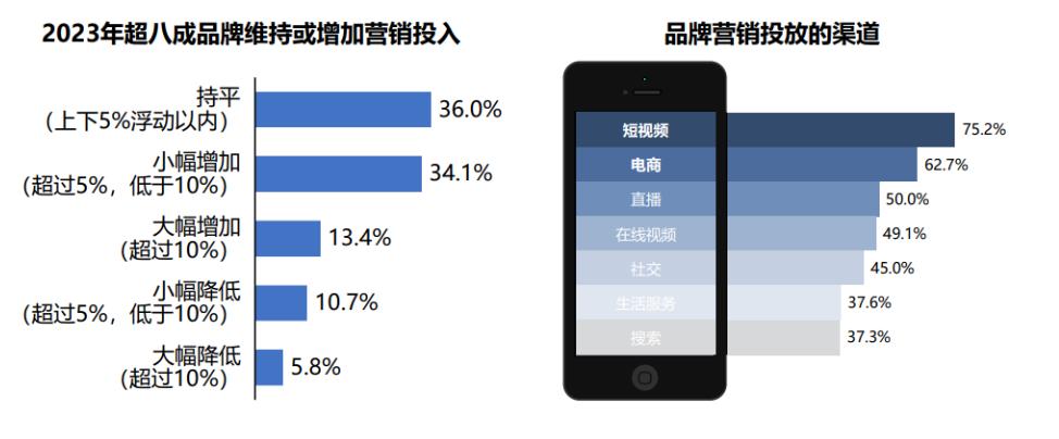 随着防疫政策的调整和优化,2023年超八成品牌会维持或增加营销投入,品牌主对未来保持稳健乐观。同时,得益于内容与电商的双向奔赴以及短视频和电商平台各自在前后链路中的优势,短视频和电商成为品牌主投放最热的两条赛道。