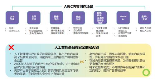 AIGC在多种主流内容形式的生产模式上产生了变革,同时能提高内容生产的效率,在游戏、元宇宙等领域有较多的应用,但目前在对极端案例的处理、细节把控、成品正确率等多方面尚待改进。对于品牌安全来讲,人工智能也是品牌安全的双刃剑,在使用的时候需要注意规避风险,品牌营销应注意勿踩红线。