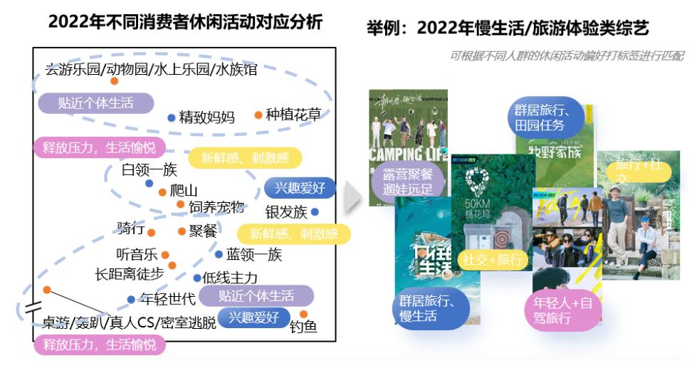 品牌应注意打造认知与共识,并且针对消费者兴趣需求投射与内容偏好,合理选择投资内容。对品牌而言:不同类型的消费者对于日常休闲消费的选择有共性也有明显差异,品牌可以针对其对应的偏好寻找相关内容,进行长线投资;对媒体平台方或媒介代理商而言:可以将剧综的细分标签和消费者偏好的活动类型进行对应,按图索骥找到适合品牌投放的内容资源。