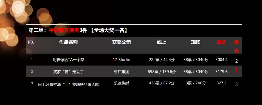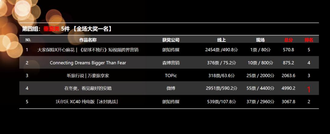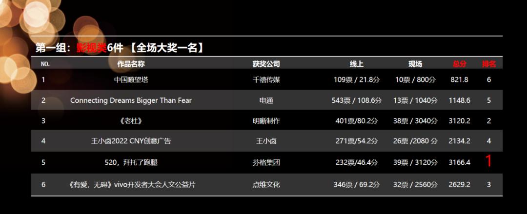 再次恭喜全场大奖获得者!星光璀璨,荣耀之日。以下为全场大奖得分排名:
