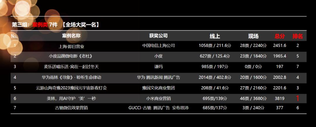 第一环节为线上大众投票PK,本环节已于2023年5月15日-21日完成,票数占总票数的20%,每票1分。第二环节为2023IAI全场大奖PK创意赛现场舞台PK,由现场评委进行投票,票数占总票数的80%,每票100分。全场大奖的评审标准兼具行业前瞻、洞察狠准与媒体联创,能够获得全场大奖的案例更是优中选优:行业代表性市场领先性未来趋势性执行完整性策略与创意的突出性耳目一新