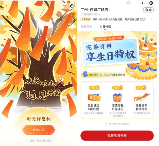 除了品牌纪念影片,遇见小面还在点餐小程序为每位消费者打造“时光许愿树”,邀请大家填写个人的生日日期,许下今年的生日愿望,明年相约重温,看愿望是否已实现。通过一颗小小的许愿树,以生日为链接,遇见小面用最具仪式感的方式拉近了消费者的距离。