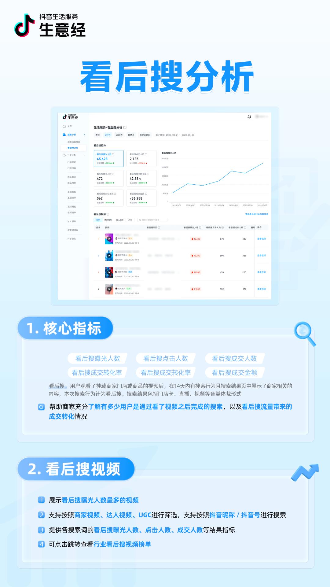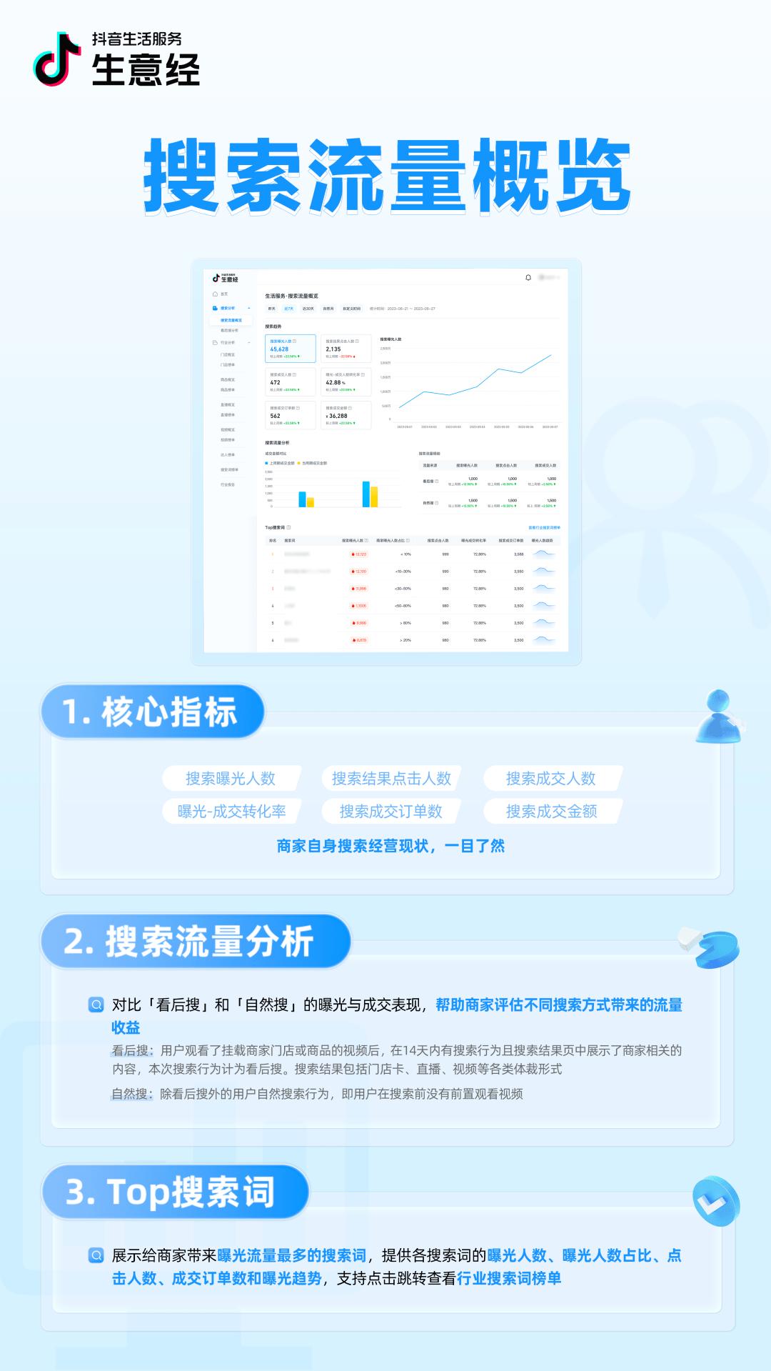 因此, 对于生活服务商家而言,搜索正在成为经营必选项 。那如何提升搜索流量与搜索转化?又如何长效经营品牌自己的搜索场? 抖音生活服务官方数据平台——生意经上线「搜索数据」能力 ,本期包含 「搜索流量概览」 、 「搜索词榜单」 、 「看后搜分析」 、 「视频看后搜索榜」 4大功能,助力商家提升搜索流量曝光和转化,从而提升经营结果。