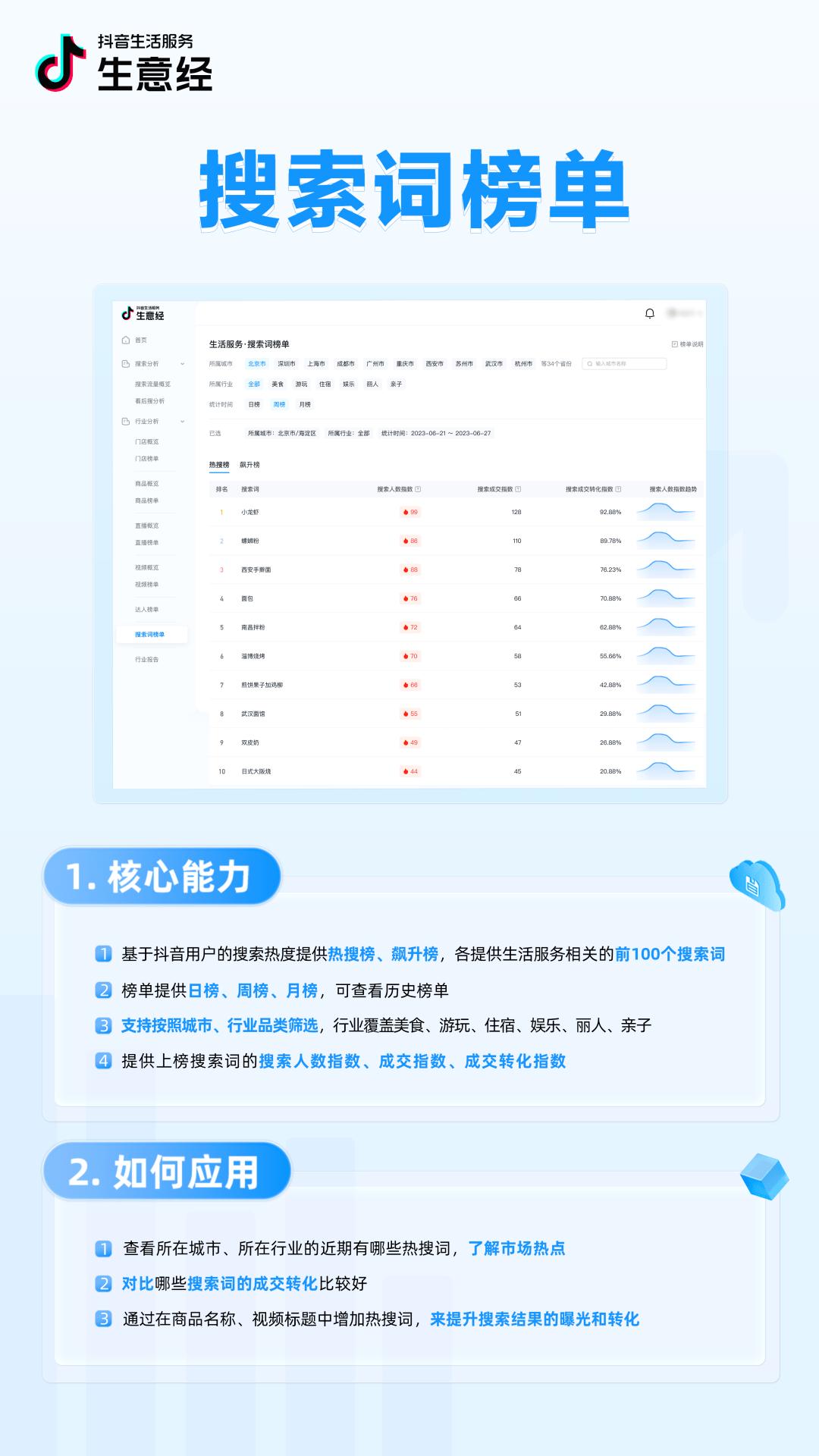 搜索词榜单——基于抖音用户的搜索热度提供热搜榜、飙升榜,帮助商家及时捕捉行业搜索热点,为内容、商品、门店等经营策略的制定提供热点参考。