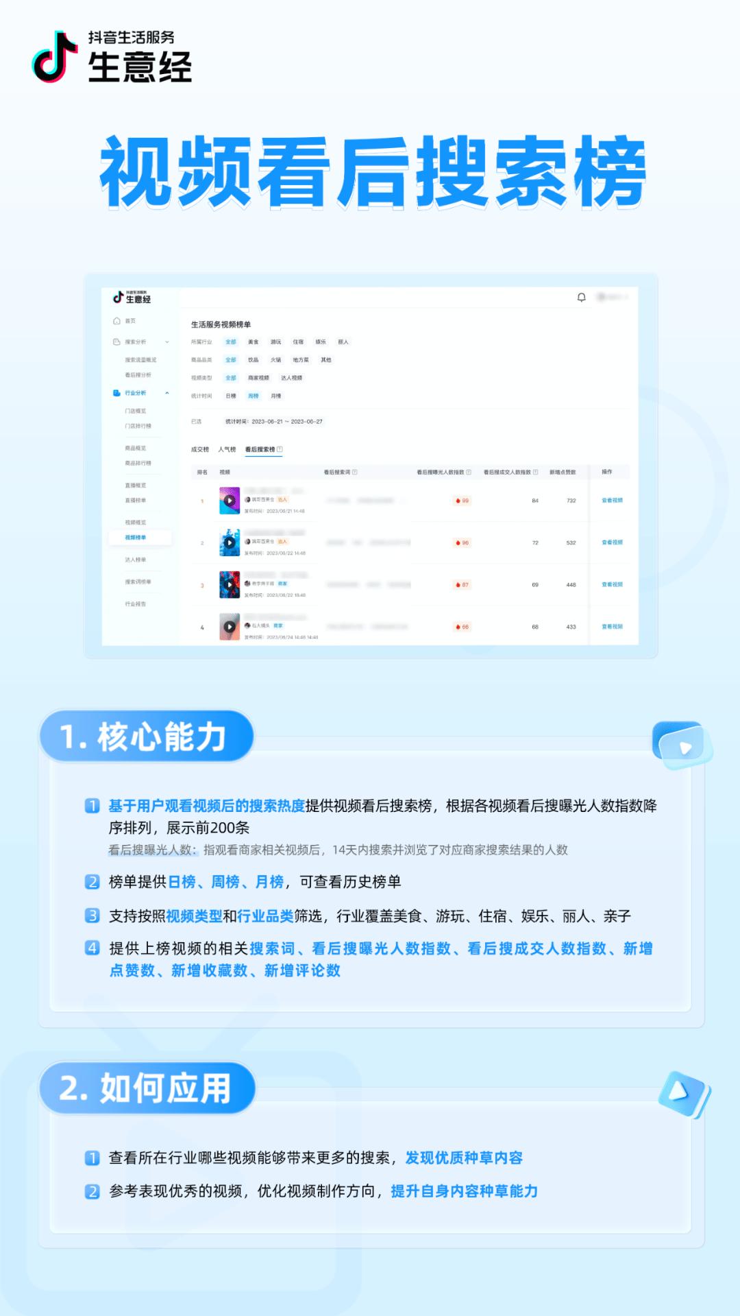 · 【搜索词榜单】和【视频看后搜索榜】:所有注册用户均可查看,通过抖音来客的【行业数据】菜单或生意经网址访问 https://www.life-data.cn/query/rank