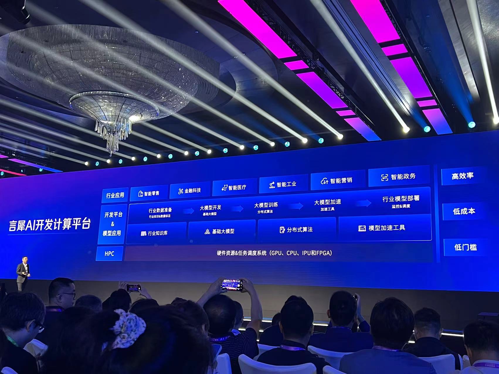 为了实现大模型的普惠,现场还演示了京东的言犀AI开发计算平台,能够为客户的大模型开发和行业应用开发,提供定制化解决方案。它既具备行业知识库,沉淀了京东自己的零售、物流、健康、金融等行业Know-How,又具备100多种训练和推理优化工具,能将通用模型迅速转化为专业模型。京东集团技术委员会主席、京东云事业部总裁曹鹏透露,言犀AI开发计算平台将于8月正式发布。