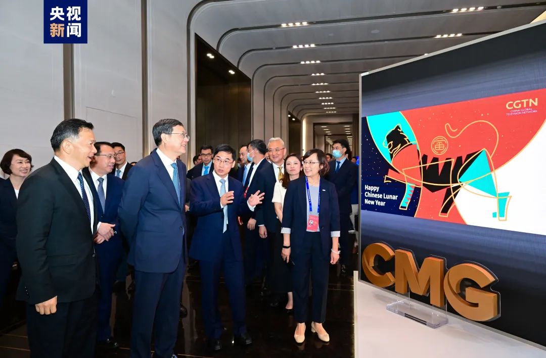 △陈吉宁和慎海雄、龚正等观看中央广播电视总台前沿科技成果及文创产品展示