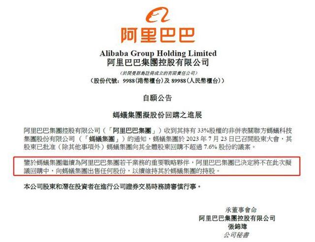 尽管蚂蚁集团已确认启动回购,阿里巴巴在最新公告中表示,“鉴于蚂蚁集团继续为阿里巴巴集团若干业务的重要战略伙伴,阿里巴巴集团已决定将不在此次拟议回购中,向蚂蚁集团出售任何股份,以续维持其于蚂蚁集团的持股。”
