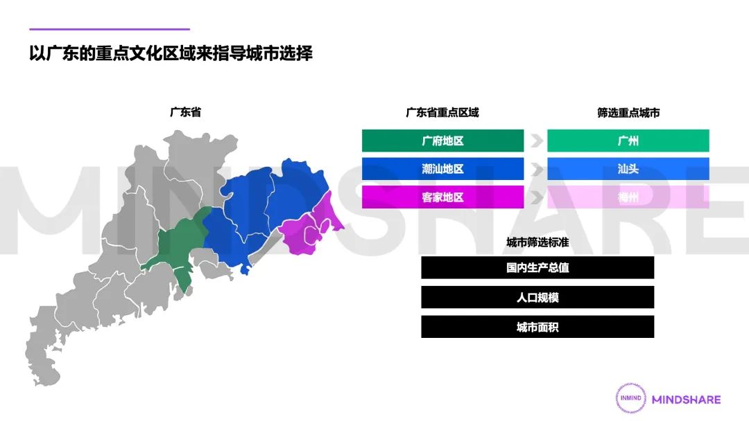 为了更直观地体现城市个性CITYnality的能力,本报告将该框架在广东省进行了实际运用。在广东众多的城市中,我们根据GDP、人口规模和城市面积三大标准,搭配三种特色文化地域,分别挑选了三个极具代表性的城市——广州、汕头和梅州作为示例。