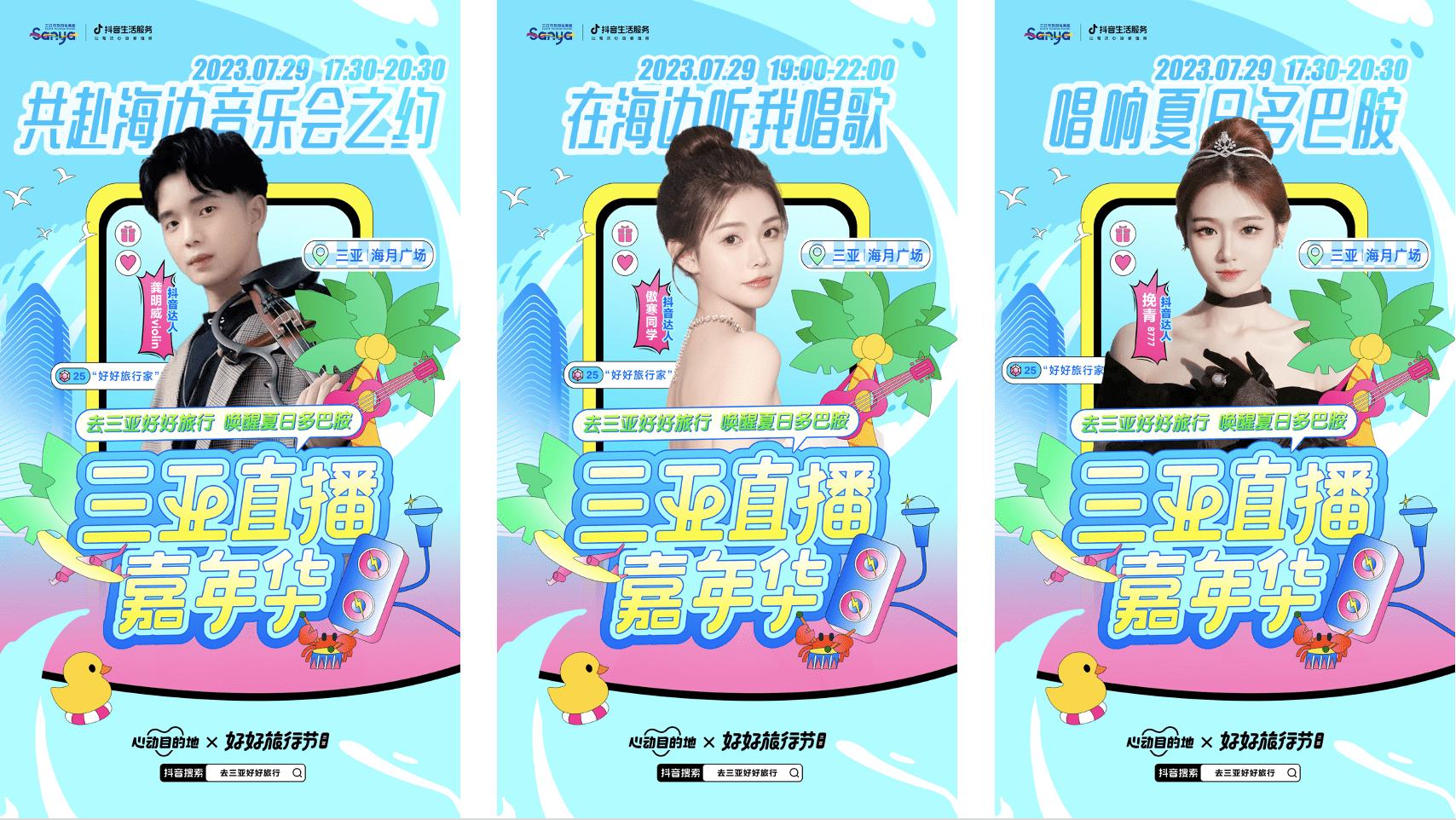 7月28日,在三亚直播嘉年华活动前夕,为了开启“以文塑旅,文旅融合”的直播新趋势,塑造三亚旅游目的地“新奇特”的户外场景内容,用地域文化激活三亚旅游消费。6位抖音才艺达人将联手本地特色景区及酒店,通过“特色演出+目的地”的创新方式开启视听盛宴直播。其中唱歌达人@诸葛孔暗、@森九、@傲寒同学、@挽青,舞蹈达人@亚阿熙,乐器达人@龚明威violin 将分别以美妙的音乐、曼妙的舞姿和动人的旋律为大家带来沉浸式观光新体验,线上观众可以跟随主播一起感受三亚酒旅文化,用音乐舞蹈拂去夏日酷暑的炎热。此次活动的直播点位覆盖蜈支洲岛、亚龙湾热带天堂森林公园、三亚湾皇冠假日度假酒店、亚特兰蒂斯酒店、三亚凤凰岛海辰光酒店等特色场景,让多彩才艺与丰富美景互相融合、相得益彰。