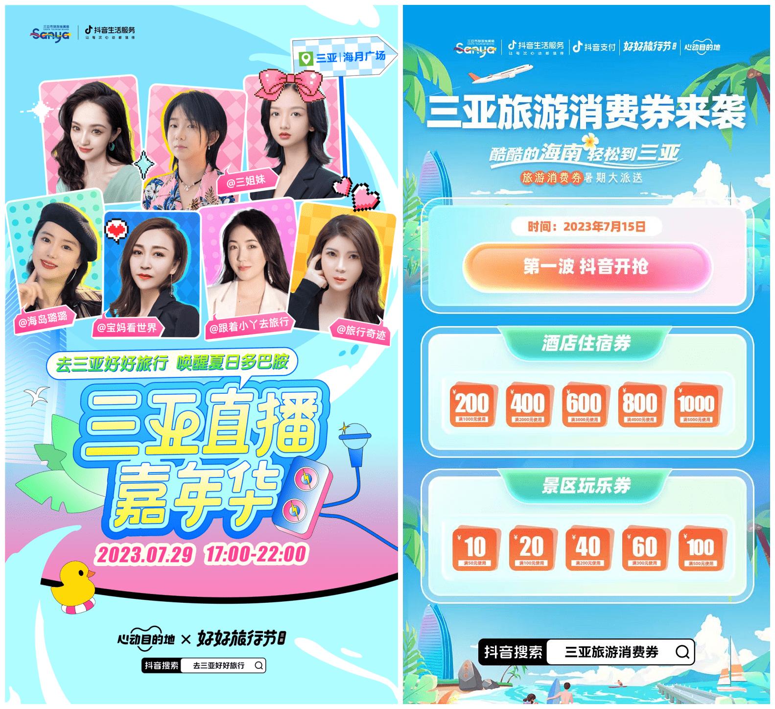 心动之旅,聚“惠”三亚,薅多场“羊毛”福利,即刻开启极致性价比的三亚游。现场还有@海岛璐璐、@三姐妹、@宝妈看世界、@跟着小丫去旅行、@旅行奇迹 5名抖音团购达人以走播的形式,带领大家感受嘉年华现场各大景点与商家带来的惊喜福利。其中,亚龙湾热带天堂森林公园为大家准备了低价雨林挑战游和雨林飞漂票;海南富力海洋欢乐世界准备了折扣亲子票;还有雅高心悦界准备的“畅玩暑期·2晚奢华海景房含早享自助晚餐”法式童游等等,更多好品等待大家前来体验。同时,活动期间还有三亚旅游消费券福利大放送,抢券下单即可享受200到1000元的大额酒店住宿券以及10到100元的景区游玩券,助力大家开启高性价比的三亚游。