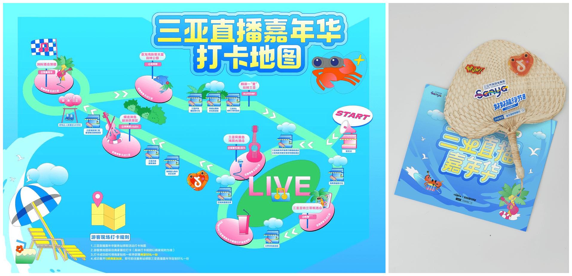 嘉年华现场更有各大商家为线下游客准备的惊喜彩蛋,打卡就可集好礼,以实实在在的优惠为炎炎夏日降温。每位游客到达现场后,即可在三亚直播嘉年华服务站领取一张活动打卡地图,携地图前往商家展位打卡(具体打卡规则以商家规则为准),打卡成功即可集商家贴纸一枚并获得商家好礼一份,成功集齐5枚商家贴纸,即可前往服务站领取三亚直播嘉年华定制好礼一份。