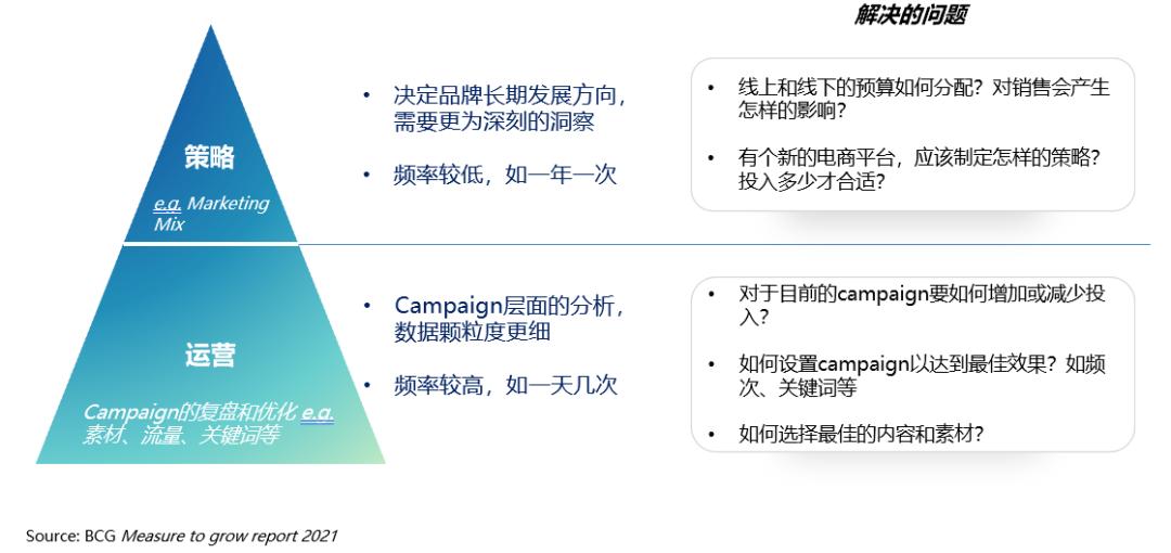 策略层面的测量通常是由品牌的高层主导,决定品牌的长期发展方向,通常会用到多维度的数据和较为复杂的模型,比如营销组合模型MMM。