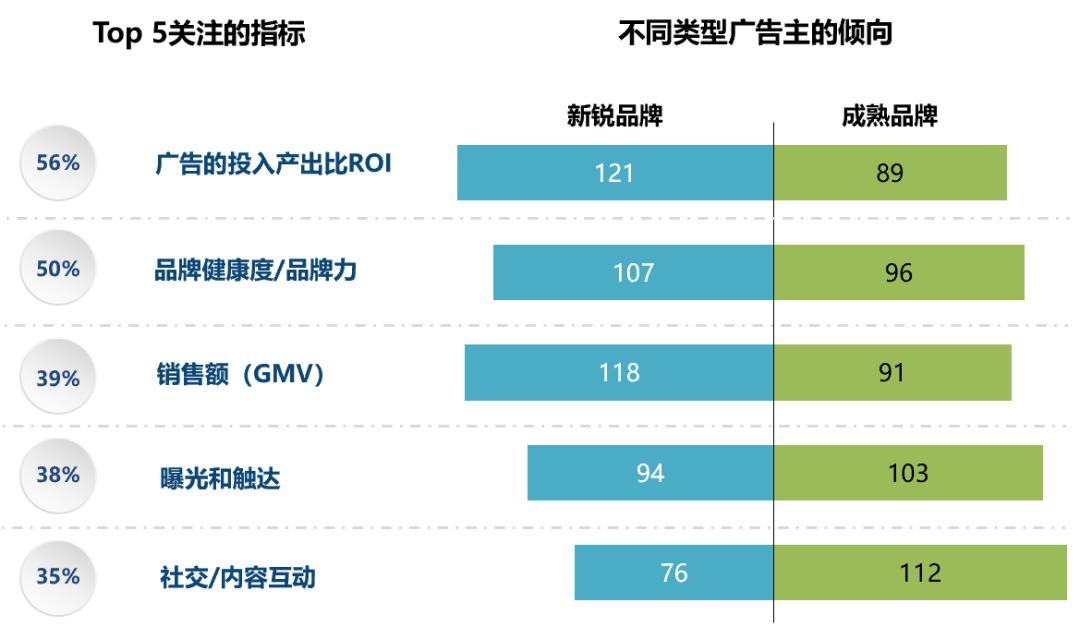 对于处在不同成长周期的品牌来说,由于每个品牌对品效销的侧重不一,因此对测量和指标的选择也不尽相同。群邑智库在2022年底对300多个品牌进行了调研(如下图,左侧百分比为选择这一指标的受访品牌比例,右侧数值代表成熟和新锐品牌在同一纬度上的偏好),发现成熟品牌更关注的指标是社交和内容的互动,而新锐品牌最关注的是广告投放的ROI和销售额(GMV)。