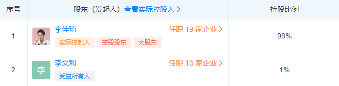 据天眼查显示,已披露的“上海琦焜管理咨询有限公司”注册资本为100万元,经营范围涵盖企业管理咨询、文艺创作、组织文化艺术交流活动、文化娱乐经纪人服务以及日用百货销售等多个领域,由李佳琦和李文利共同持股。其中公司的实际控制人为李佳琦,持股比例为99%,李文利持股比例为1%。