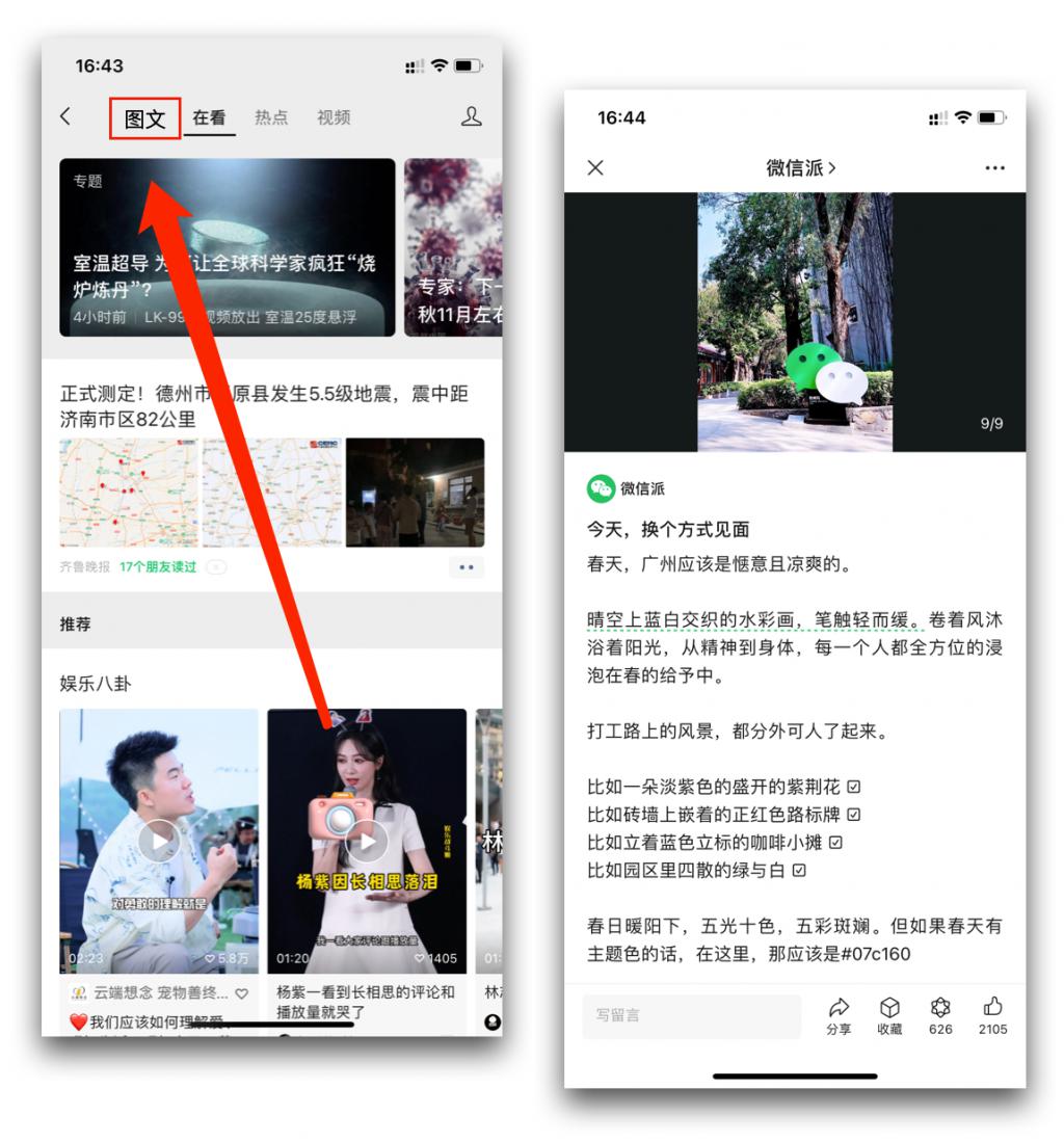为了应对轻量化内容信息平台的冲击,微信在 " 看一看 " 中新增了 " 图文 " 板块,为用户提供了一个统一入口,以便浏览和消费碎片化内容。