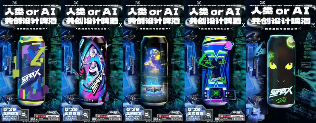 例如勇闯天涯superX曾发售过五款特别包装的产品,其中四款由AI设计师创作。产品发售后,品牌邀请用户猜测四款新产品究竟出自人类设计师还是AI设计师,以图灵测试的互动方式为产品增添了一份未来感和悬疑感。AI与人类共同设计瓶身的设定不仅让产品更有噱头,也引发了AI与人类共生共存的思考,吸引了年轻消费者的关注。