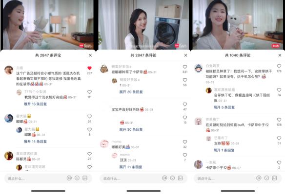 在笔记评论区中,“被种草了”、“介绍好详细”、“好有趣”等词汇高频出现,其中一位小红薯留言说被嘟嘟种草了卡萨帝,还有的小红薯聚焦产品本身,问起了烘干功能。从对明星的关注到对产品本身的关注,种草内容广受好评,治愈系灵感洗衣房的概念深入人心。