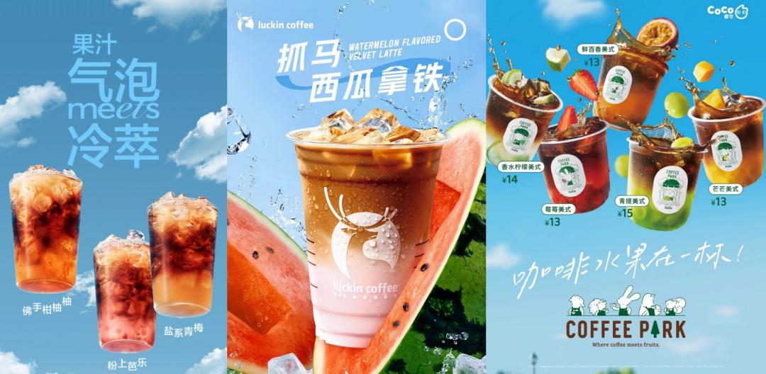 随后,不知道是哪位“媒人”率先给咖啡和水果拉郎配,让「果咖」品类迅速爆红,引发一场“水果大乱炖”。西瓜抓马、青梅拿铁,暴打柠檬美式,就连芭乐无花果,也成为了play的一环。如今,咖啡又把手伸向中国人最熟悉的「中式茶」,并不断尝试新的茶底,酝酿着创造爆款。