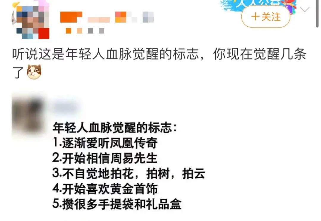 在内卷加剧的咖啡赛道,品牌们创新产品的速度也快了起来,咖啡口味从原始的苦涩改良为醇香再进化为清香,形态也从「奶咖」到「果咖」再到「茶咖」,不断迭代升级。套用鲁迅先生的一句话:中国人的想象在“饮食”这一层,竟如此跃进。而这也正是「茶咖」出圈的原因之一。2)赶上年轻人“血脉觉醒”的风口最近一段时间,年轻人“血脉觉醒”的段子在社交媒体上广为流传。人只要到了20岁,刻在中国人DNA里的神秘力量就会苏醒,开始喜欢上做些自己曾经嗤之以鼻的“老派”举动,比如拔火罐、练八段锦、以及泡茶,正所谓“嘲笑中年人、理解中年人、成为中年人、超越中年人”。