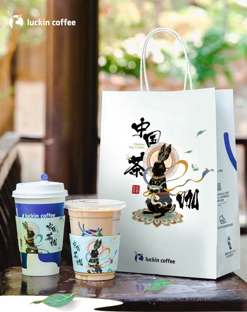 如果说「茶咖」在去年还是一片蓝海的话,那么今年可能已经属于红海赛道了。在看到市场的潜力后,越来越多的品牌开始布局这一品类,品牌多了,市场自然也就卷起来了。1)卷颜值既然是顶着“新中式”的title,那在包装方面自然少不了与中国风元素的结合。瑞幸推出茶咖限定包装“敦煌奔月黑兔兔”,杯套+纸袋上印有可爱的兔子和敦煌飞天的元素,鲜明色彩的壁画风格与可爱的兔子形象相得益彰,浓郁的国风色彩让瑞幸茶咖的中式风格愈加鲜明。