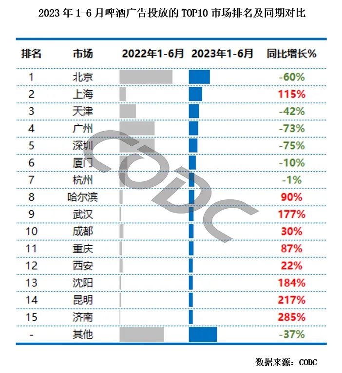 从市场投放看,去年1-6月在泰山原浆啤酒的广告攻势下,北京、广州、深圳的广告投放最突出,今年随着泰山原浆啤酒广告的降温,这三大城市的广告投放明显缩水,但北京仍居首位。上海在雪花啤酒的集中投放下同比翻倍,广告排名从同期的第八名跃升至第二名。