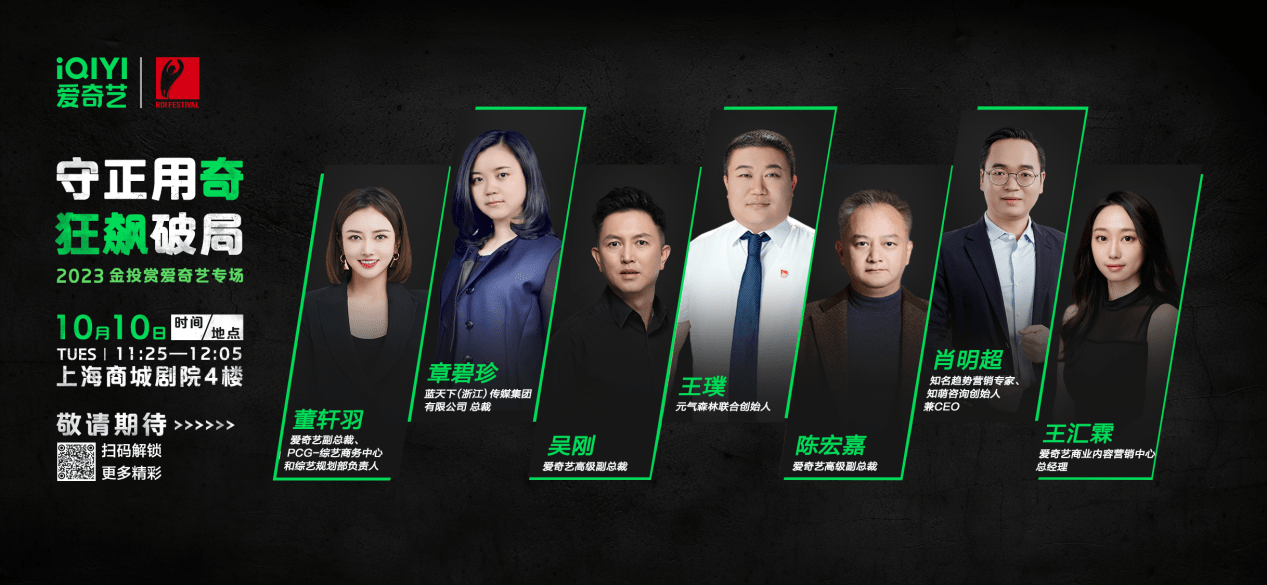 本次爱奇艺专场将于10月10日11:25-12:05进行,嘉宾们将围绕《守正用“奇”、“狂飙”破局》主题展开演讲及圆桌讨论,分别从平台策略、内容营销生态、品牌投放价值、未来趋势等角度,分享如何运用“丰富的优质内容储备+宝藏人群+营销方法论”,实现品牌价值积累与销售增长。