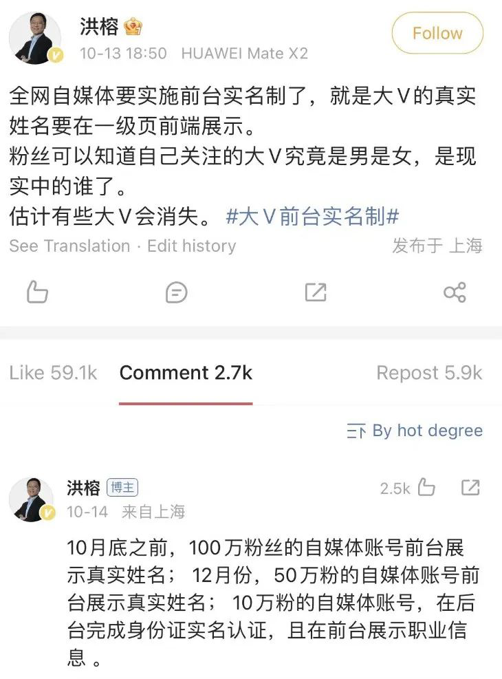较早传出这一消息的是名为洪榕的财经博主,他称“10月底之前,100万粉丝的自媒体账号前台展示真实姓名; 12月份,50万粉的自媒体账号前台展示真实姓名; 10万粉的自媒体账号,在后台完成身份证实名认证,且在前台展示职业信息”。