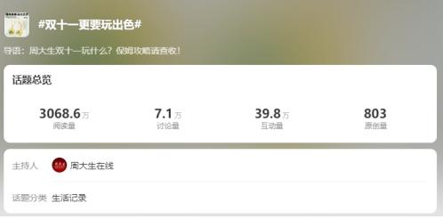 在微博热门话题#双十一更要玩出色#下,只要用户转发活动微博,并在其中积极参与讨论,便有机会获得四个品牌共同送出的,包含周大生海洋之心套链、桃花姬阿胶盒等一系列好礼的大礼包。新颖的玩法、超值的奖品,让该话题成功累计获得了超3000万的曝光量。