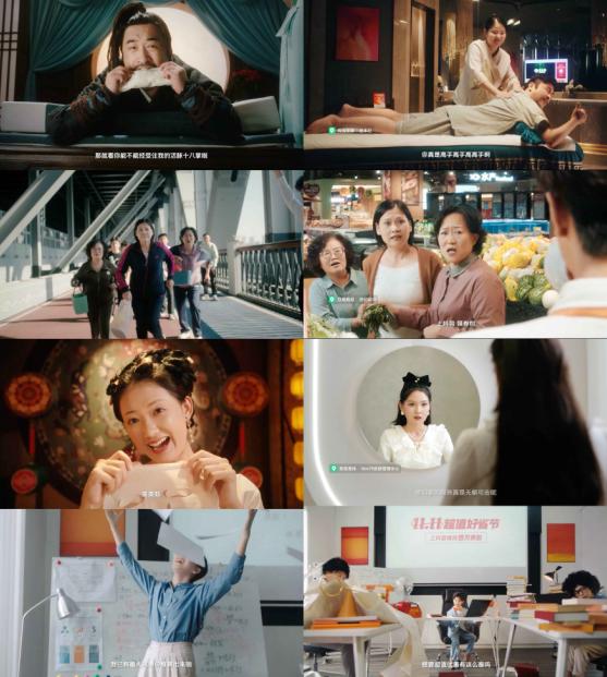 在价值沟通层面,四支脑洞视频可谓是“最不像大促广告的大促广告”。活动将大促广告搬进了“脑洞世界”里,借助“冷宫娘娘逆袭独立大女主”“高手穿越爱上现代按摩”“中国大妈短跑大赛”“白领提案输给小学生”四个超乎想象的故事剧情,将平台“服务超值”“省时省力”“价格超值”“质量超值”四大核心大促优势形象地透传至用户心中,让大促广告从给用户带来“优惠好品”升维至“氛围沉浸”,全方位增强用户在大促过程中的体验感。这与抖音生活服务综合行业一直遵循的行业愿景「成为多元“心”生活的引领者,让美好体验触手可及」有着密切的关联:“美好体验”不仅是为用户带来价低、质好的商品,更多的是真正走进用户,懂用户所想、所需。