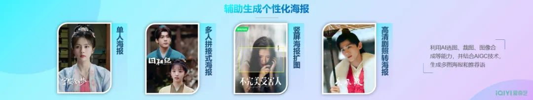 目前,爱奇艺已率先开始在内容策划、开发、制作、宣发等核心环节落地生成式AI的应用,并在文本、图片、声音、视频四大应用场景形成了一定生产力。比如“我们大量的影视综内容都是横版的,但大家的手机却是竖屏,爱奇艺已经可以利用生成式AI截取横版画面并扩图为竖版的海报物料。”在宣发时,热门剧综如《长风渡》和《乐队的夏天第3季》站内外宣发中,已经利用AI选图、裁图、合成图像产出个性化海报等物料。