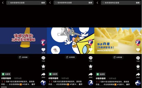 为了进一步激发用户的情怀带动消费热情,瑞幸咖啡官方发布了揭秘“生酪消失现场”的品牌TVC,以TOM和JERRY的视角进一步撬动消费者的童年记忆。并持续联动众多抖音达人,延续联名合作二创活动,通过优质短视频内容和UGC内容实现联名合作的深度传播和新品的全民种草。