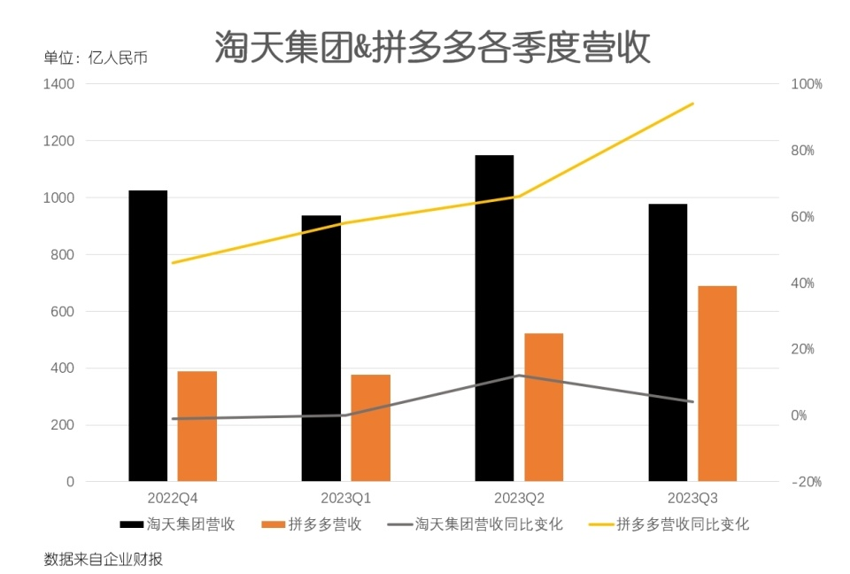 三季度,淘天集团的总营收为976.54亿元,同比增长4%。其中最关键的客户管理收入为686.61亿元,同比增长3%,增速已经相当缓慢。拼多多三季度营收则录得688.4亿元,同比增速93.9%,两项数据都远超市场预期。
