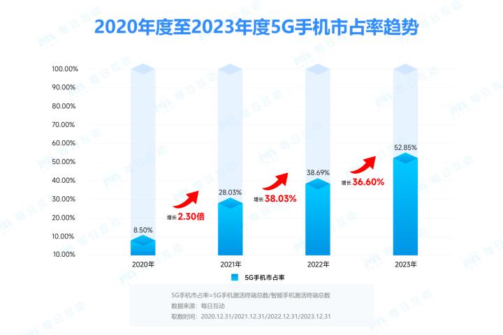 近日,发布的《2023年度5G手机报告》显示,截至2023年12月31日,国内5G手机市场(包含华为搭载自研芯片智能手机)市占率依然保持增长趋势。5G手机在智能手机市场的占有率达52.85%。5G手机自2019年年中正式面世到2023年底,用了约四年半的时间就占据智能手机市场领先位置。