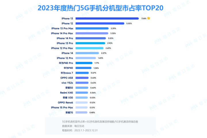 2023年度哪些手机成为年度热门机型?数据显示,iPhone 5G手机表现突出,从其第一款5G手机iPhone 12系列到2023年9月新上市的iPhone 15系列,均榜上有名。其中iPhone 13以7.54%的市占率排名第一,成为2023年的年度最热门机型。华为P40系列、华为nova7忠实拥趸众多,自上市后持续上榜。荣耀70、荣耀50和荣耀X30入围2023年热门机型TOP20,是荣耀旗下表现亮眼的机型。