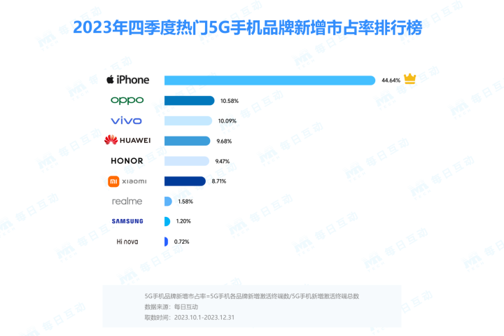 数据显示,2023年四季度,iPhone 5G手机新增市占率达44.64%,排名第一。2023年下半年,第三方销售平台对于iPhone系列手机的降价促销,推动了销量的增加;OPPO新增市占率为10.58%排在第二位。vivo 5G手机新增市占率达10.09%,排名第三。华为5G手机新增市占率为9.68%,排在第四。荣耀和小米5G手机新增市占率排在第五和第六位。