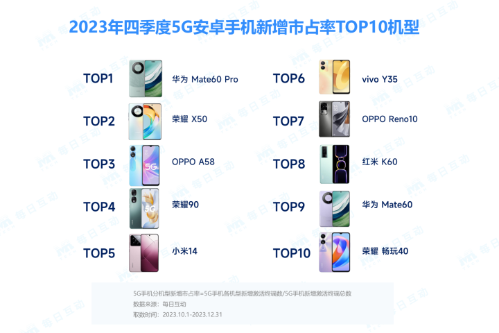 进一步分析安卓5G手机2023年四季度的新增情况。数据显示,2023年四季度,华为Mate60系列有两款机型入围新增市占率TOP10,其中华为Mate60 Pro最“叫座”,排名第一。荣耀旗下三款机型入围TOP10,其中荣耀X50和荣耀90的新增情况排名领先。