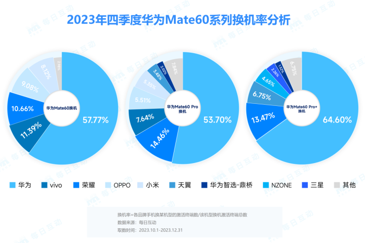 四季度,都有谁换上了市场超新星的华为Mate60系列呢?华为的老用户们“遥遥领先”于其他品牌的手机用户,Mate60系列的换机用户中华为用户占比均超50%;其次是荣耀、vivo以及天翼手机的用户。