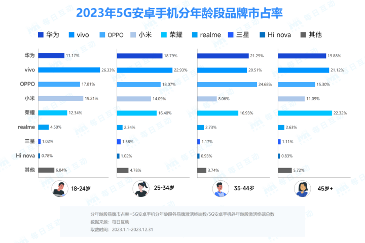 数据显示,vivo 5G手机品牌市占率在各年龄段用户中占比均超20%,排名靠前。在18-24岁、25-34岁这两个年轻人群中,vivo的占比排名第一,特别是在18-24岁年龄段人群中占比高达26.33%,牢牢抓住年轻人群的目光。在35-44岁年龄段中,OPPO 5G手机品牌市占率达24.68%,排名第一。在45岁及以上年龄段用户中,荣耀5G手机市占率达22.32%,继续保持第一位置。